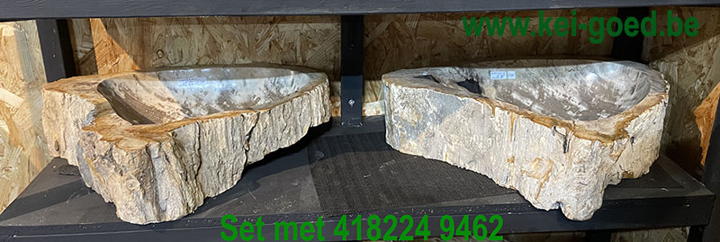 Zolang nog beide aanwezig is deze als set te leveren, zie foto. Beide waskommen zijn uit hetzelfde deel van versteend hout verkregen.