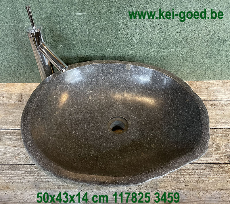 Gootsteen van riviersteen, een granietsoort, is een rivier kei. Gevormd door de natuur, de constante beweging van de aarde, het schuren van het aldoor stromende water. De natuur heeft er miljoenen jaren over gedaan om deze keien zo te vormen. Alleen de harde kern is overgebleven, een granieten kei. Zoeken en verzamelen is zwaar werk, we vinden deze in de meest onherbergzame gebieden hoog in de bergen en jungle. Waar de rivieren in de zomertijd vaak droog staan. En tijdens de moesson het water van de tropische regen met grote kracht en snelheid naar beneden raast. Richting zee het water schuurt zo lang en hard, zo ontstaat ook het bekende rivierzand wat zéér fijn steentjes of kiezel is. Dit zand wordt weer gebruikt om het harde door de mens gemaakt beton en mortel oftewel specie van gemaakt wordt. Gootsteen van riviersteen