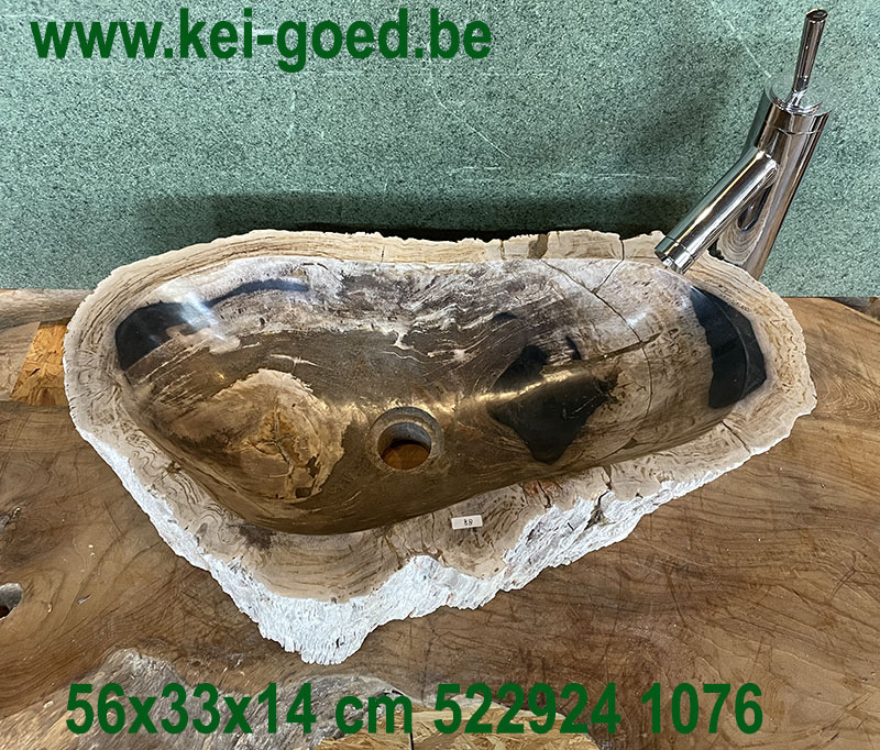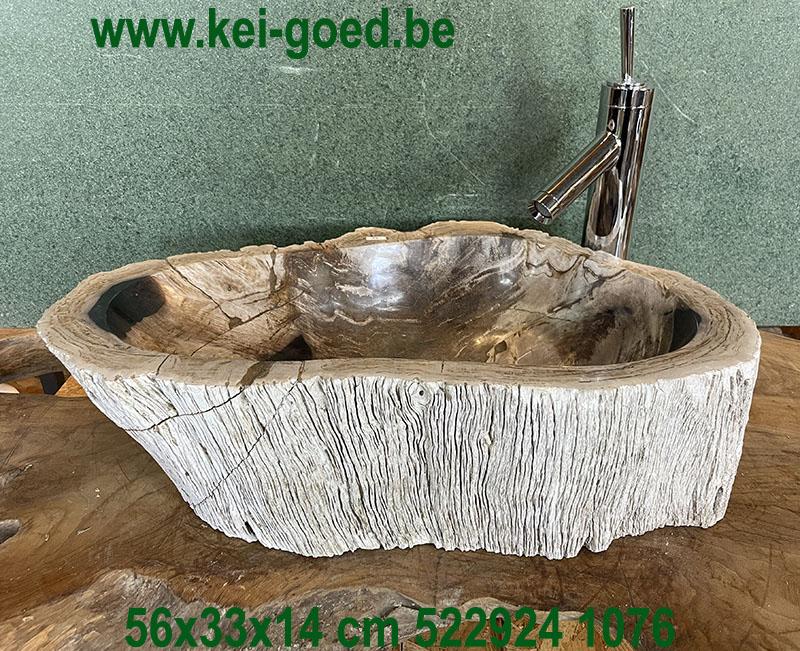 Versteend hout Deze wastafel van gefossiliseerd hout is zéér bijzonder. Er zijn nog maar weinig plaatsen in de wereld, waar deze fossielen versteend hout in grote maten nog gevonden wordt. In Indonesië wordt op enkele eilanden wordt nog versteend hout gevonden. Het valt niet mee om deze versteende bomen of delen daarvan te delven. Vaak wordt versteend hout gevonden diep in de jungles van Indonesië. Soms wordt versteend hout gevonden in rivieren, deze zijn door aardverschuivingen en vulkaan uitbarstingen aan de oppervlakte van de aarde komen te liggen. Ook dan is het niet zo eenvoudig om dit materiaal te delven. Een mijning vergunning is vereist om versteend hout op te graven en te vervoeren. Ook moet het land diep in de jungle, in de originele staat terug gebracht worden.