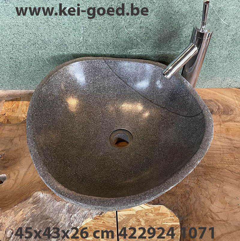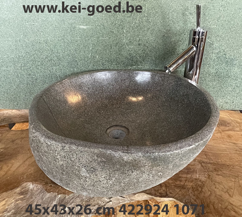 natuurstenen waskom, kiezel, Rock bassin rocher, is een rivier kei. Gevormd door de natuur en de constante beweging van de aarde, het schuren van het aldoor stromende water. De natuur heeft er miljoenen jaren over gedaan om deze keien zo te vormen. Alleen de harde kern is overgebleven, een granieten kei. Kei hard en kei-goed. Zoeken en verzamelen is zwaar werk, we vinden deze in de meest onherbergzame gebieden hoog in de bergen en jungle. Waar de rivieren in de zomertijd vaak droog staan, en tijdens de moesson het water van de tropische regen met grote kracht en snelheid naar beneden raast. Richting zee, het water schuurt zo lang en hard, zo ontstaat ook het bekende rivierzand wat zéér fijn steentjes of kiezel is. Dit zand wordt weer gebruikt om het harde door de mens gemaakt beton en mortel oftewel specie van gemaakt wordt. Pompbak van een granietsoort riviersteen.