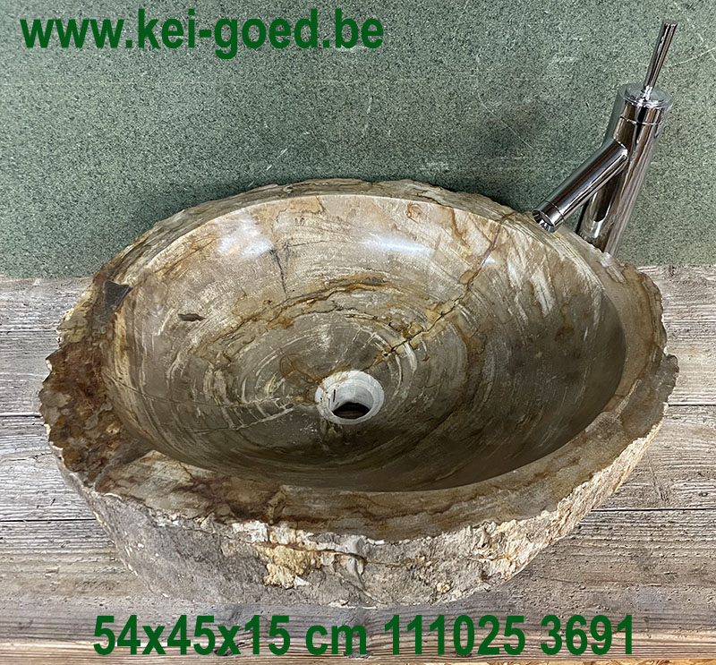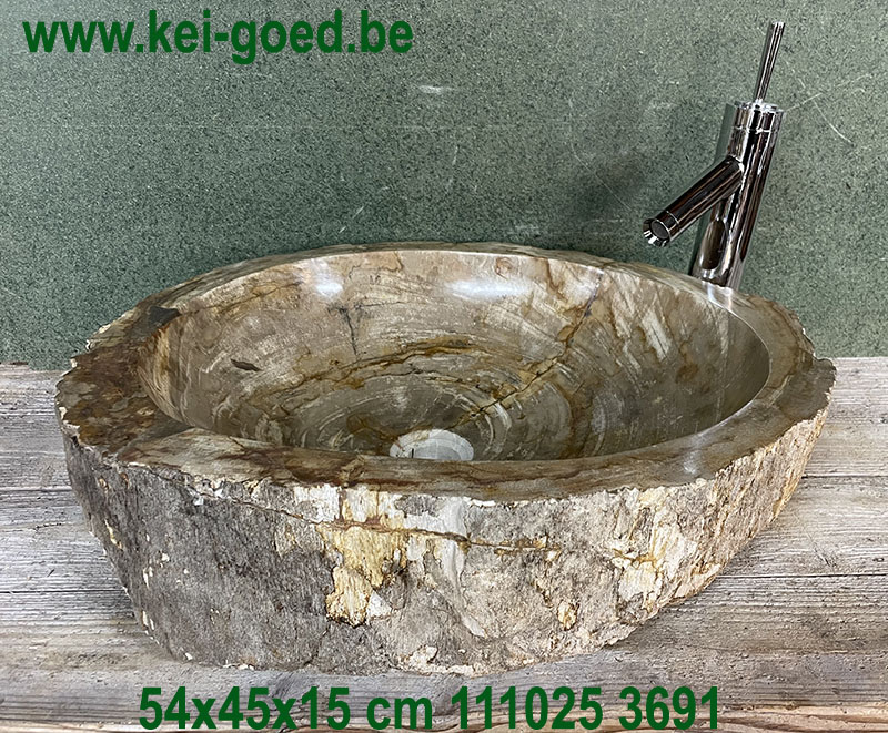 Versteend houten wastafel kleur beige-bruin. Deze wasbak van natuursteen versteend hout, wat een fossiel is en zeldzaam. Is een uniek product in de badkamer. Dit fossiel van hout versteend heeft een aardende en kalmerende werking. Het bevordert onze connectie met de aarde en vermindert heimwee. Daardoor hebben we altijd het gevoel op de goede plek te zijn en voelen we ons thuis. De steen kalmeert, zorgt voor een fijne sfeer en een gevoel van welzijn. Het bevordert een nuchtere houding, concentratie en beheersing. Fysiek stimuleert versteend hout de stofwisseling en gaat overgewicht tegen. Fossiel versteend hout waskom en deze dan in Uw badkamer hoe cool is dat! Deze waskom van versteend hout is strak in een haakse hoek te plaatsen. De hoek afkitten is wel gewenst, niet voor de wasbak daar kan niets mee gebeuren. Die heeft een hardheid van 7 tot 8 op de hardheidsschaal van Mohs. Diamant heeft 10 op diezelfde schaal.